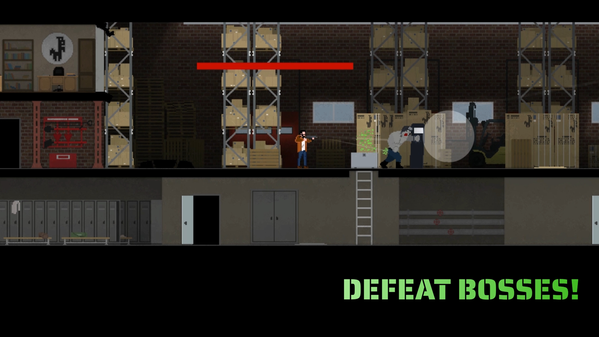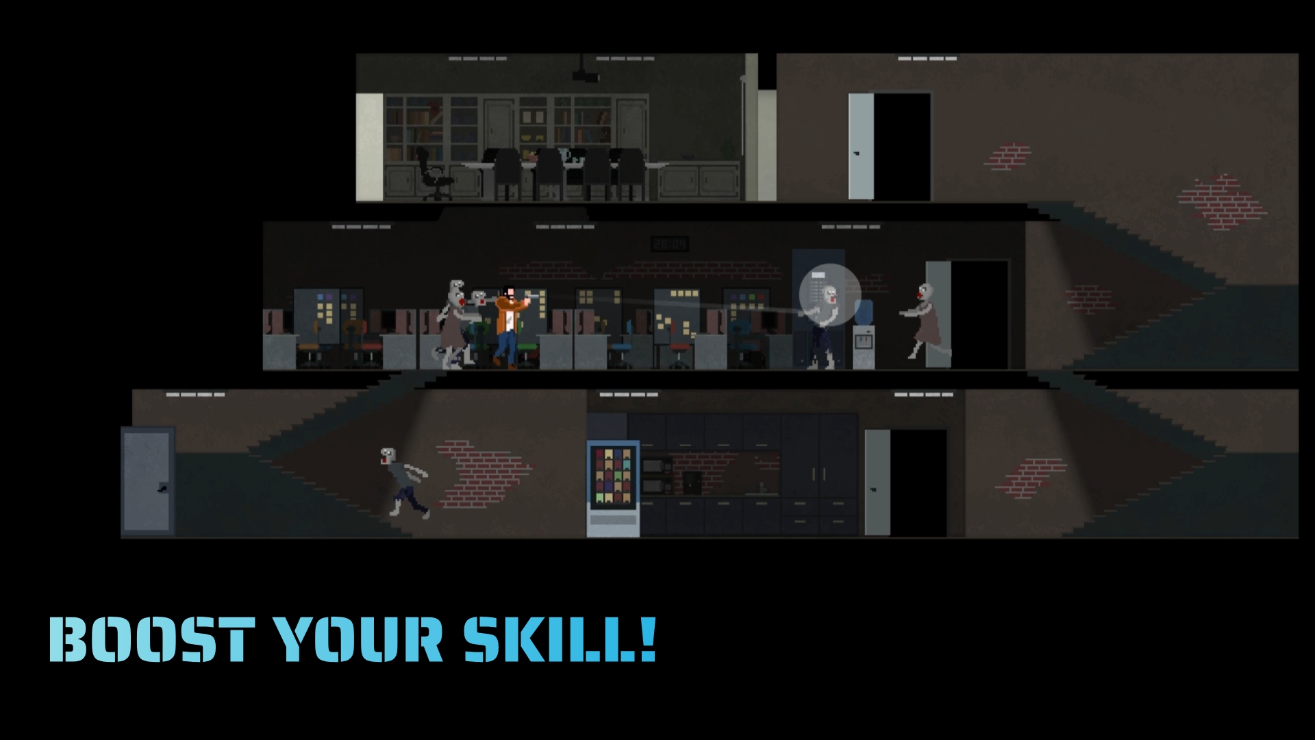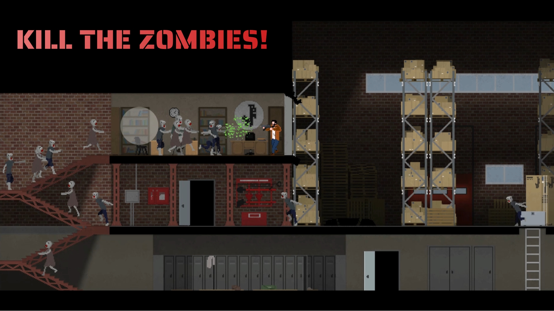 战斗僵尸!完成关卡,击败老板,购买和升级武器,提高你的射击技巧。路障门控制水平上僵尸的流动。粉碎橱柜以粉碎僵尸并减缓迎面而来的人群。