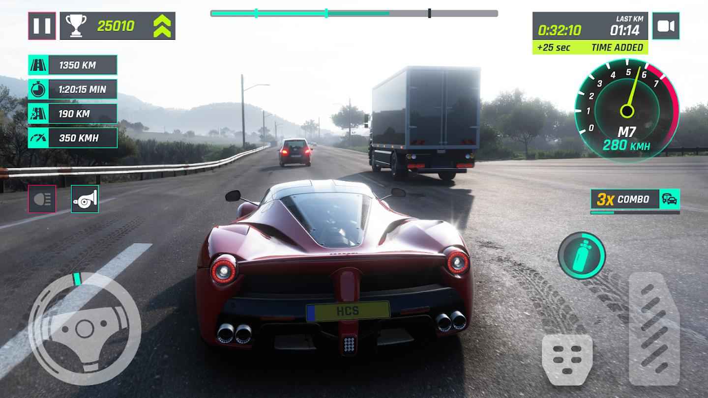 惊人的图形:沉浸在最逼真的 3D 图形中,为无与伦比的高速交通驾驶体验量身定制。陶醉于复杂的汽车损坏、完全可操作的后视镜和动态反射等功能,带来真正的高清高速公路赛车感觉。