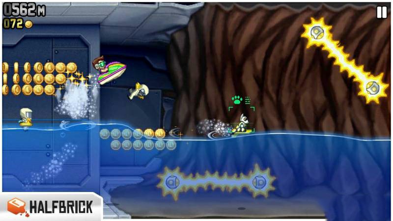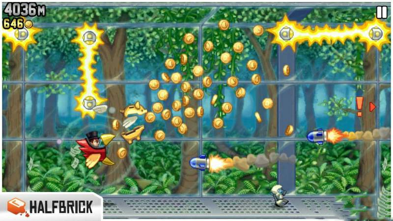 《疯狂喷气机Jetpack Joyride》是一款横版酷跑游戏,疯狂喷气机游戏主角巴里(Barry)潜入了一座神秘的工厂,夺走了邪恶的科学家们正在研制的个人火箭飞行器。跟着他利用火箭飞行器逃离出这个神秘工厂吧。用飞行器上的机枪驱赶邪恶的科学家,上下飞行来避开工厂里各式各样的障碍物,收集金币,得到尽可能高的分数。这也是一款画面华丽的游戏,游戏节奏会随着你活得的各种道具而发生变化,让你在时快时慢的节奏中挑战自己的反应速度和决断力。