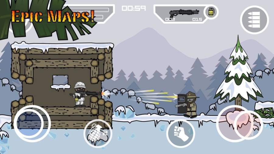 《涂鸦军团2:迷你民兵Doodle Army 2 : Mini Militia》是一款节奏极快的横版射击游戏,通过使用各式武器,在同伴的掩护下与邪恶的机械军团,进行激烈的军事火拼。游戏在操作方面较为特别,将转向和射击按钮结合在一起,使用户在移动操作之余,也能轻松控制转向和射击(将转向按钮拖动至极限,达成射击操作),手感非常舒适,配合上游戏中的飞行设定,和枪械设定等内容,致使游戏在内容上和观感上都具有相当的可玩性。